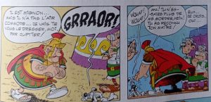 Les grammaires françaises insistent sur le fait que le datif éthique s’applique généralement à la deuxième personne – Il te lui a filé une de ces gifles (Grammaire méthodique du français, Riegel, Pellat et Rioul 1994 : 226). Elle est interprétée, selon la grammaire, comme une invitation au destinataire. Le destinataire est pris comme témoin de la scène de sorte qu’il s’implique affectivement dans l’action décrite. Dans cette image tirée d’Astérix (Astérix et la rentrée gauloise), le centurion romain prend son légionnaire à témoin de la scène où il va éduquer correctement le chien Idéfix – Je vais te le dresser. On pourrait y voir presque un double datif éthique – te vous. Ici, les pronoms de deuxième personne ne jouent aucun rôle actif. Ils assistent simplement au dressage du chien.
