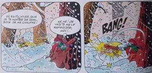 De même, dans cette autre image d’Astérix (Astérix et la rentrée gauloise), un lutin d’hiver tente de refroidir le lutin de printemps. Pour ce faire, il se dit : Je vais te me le refroidir moi !